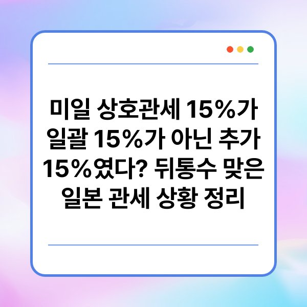 미일 상호관세 15%는 기본적으로 부과된 세금 외에 추가로 15%가 더해지는 구조입니다. 이는 일본 기업들이 사실상 30%의 관세를 부담하는 것을 의미합니다. 이러한 중복 세금 부과는 일본 기업에게 상당한 재정적 압박을 가하게 됩니다.